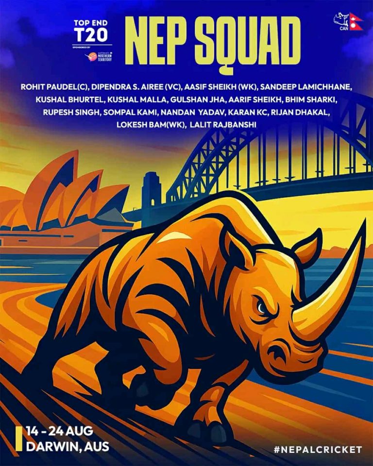 रोहित पौडेल(कप्तान), दीपेन्द्रसिंह ऐरी(उपकप्तान), आसिफ शेख, सन्दीप लामिछाने, कुशल भुर्तेल, कुशल मल्ल, गुल्सन झा, आरिफ शेख, भीम सार्की, रुपेश सिंह, सोमपाल कामी, नन्दन यादव, करण केसी, रिजन ढकाल, लोकेश बम र ललित राजवंशी